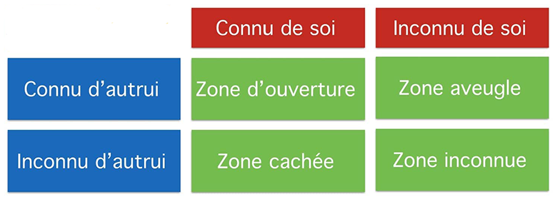 Imaginé par Joseph Luft et Harrington Ingham en 1955, il distingue 4 zones, déterminées par le degré de connaissance de soi et le degré de connaissance par les autres. En clair :